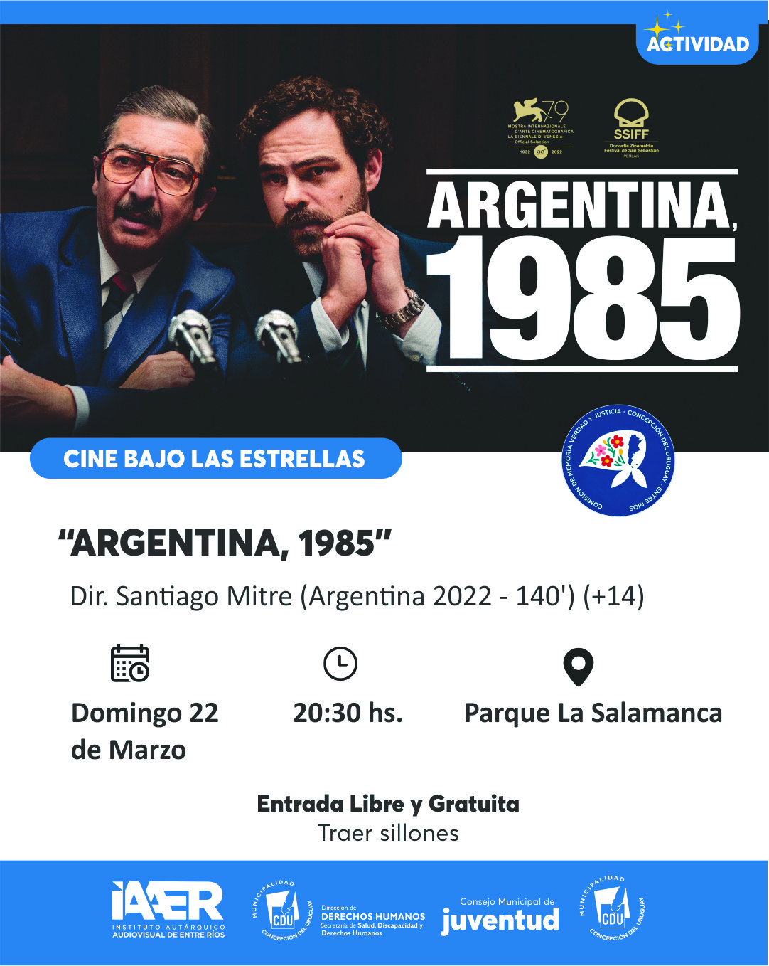 El domingo 22 de marzo a las 20:30 horas se realizará una nueva edición del ciclo “Cine Bajo las Estrellas” en el Parque La Salamanca, donde se proyectará la película “Argentina, 1985”. La actividad será con entrada libre y gratuita, y se recomienda a los asistentes llevar reposera o manta para mayor comodidad.