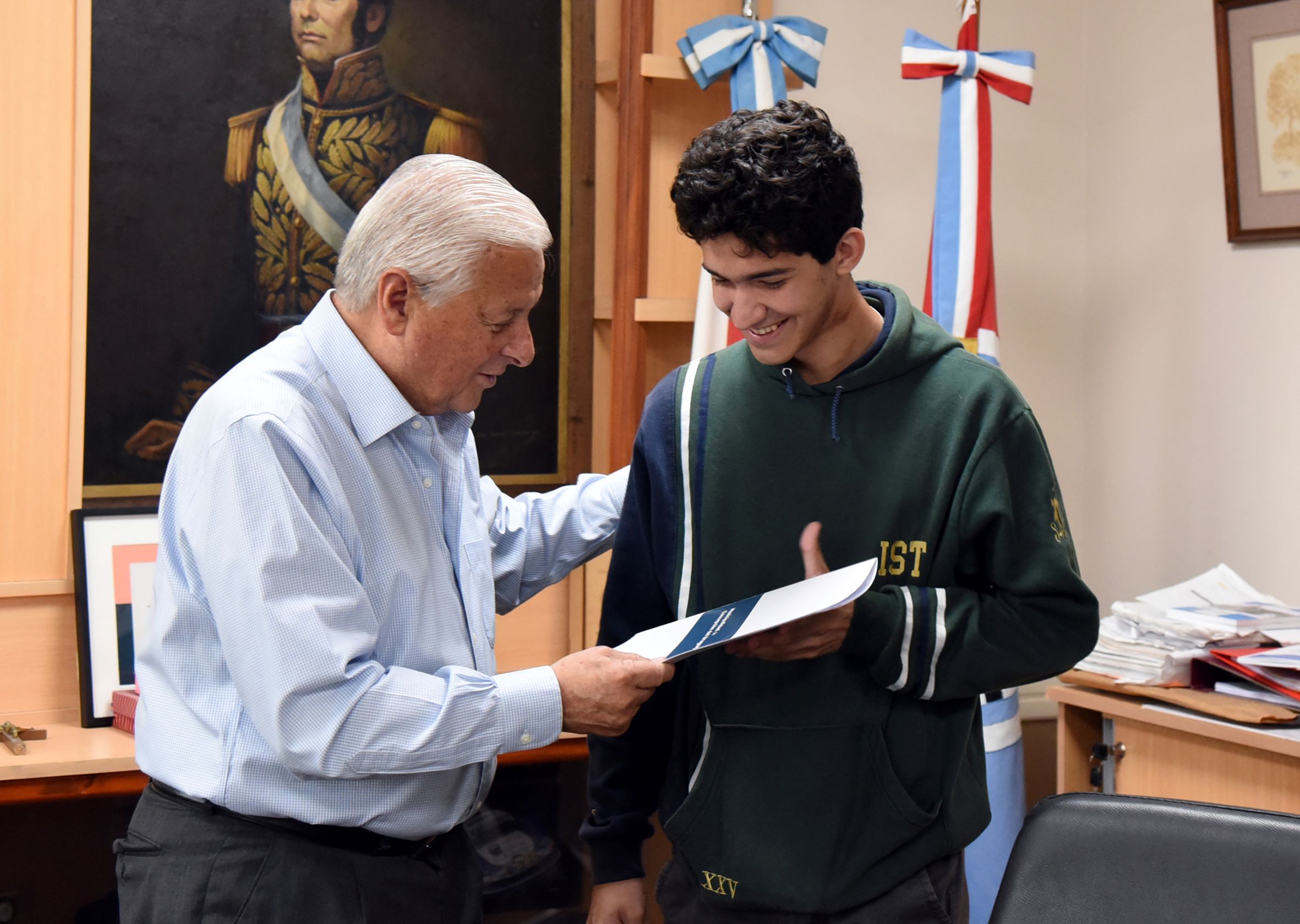 Durante el encuentro, del que participaron también el padre del alumno, Mariano Chamot, y la rectora de la institución, Rosana Sosa, el intendente le hizo entrega de un aporte económico en reconocimiento y acompañamiento a su participación.