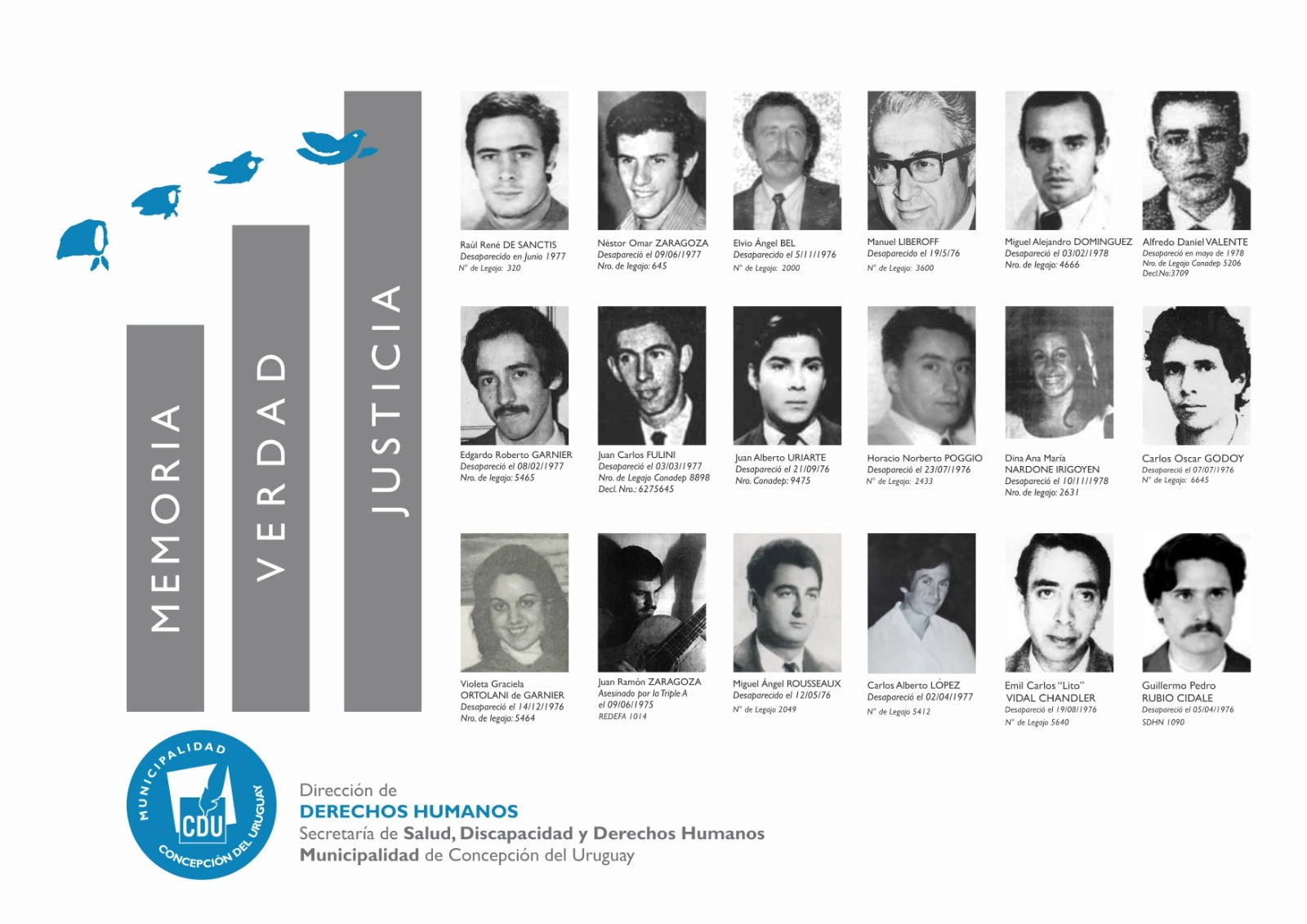 El miércoles 18 de marzo se realizará desde la Dirección de Derechos Humanos de la Municipalidad de Concepción del Uruguay, la capacitación para nuevos guías de la Muestra “HISTORIAS NUESTRAS ¿Qué marcas nos dejó el terrorismo de Estado?”. Será en la sede de la Facultad de Humanidades, Artes y Ciencias Sociales de 25 de Mayo y Estrada, desde las 8 hs.
